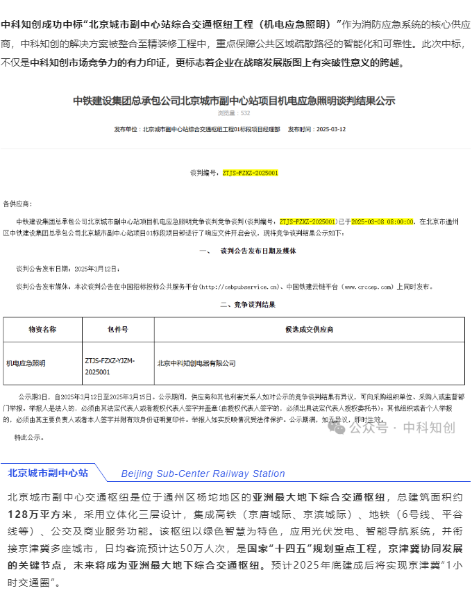 中科知创成功中标“北京城市副中心站综合交通枢纽工程(机电应急照明)”
